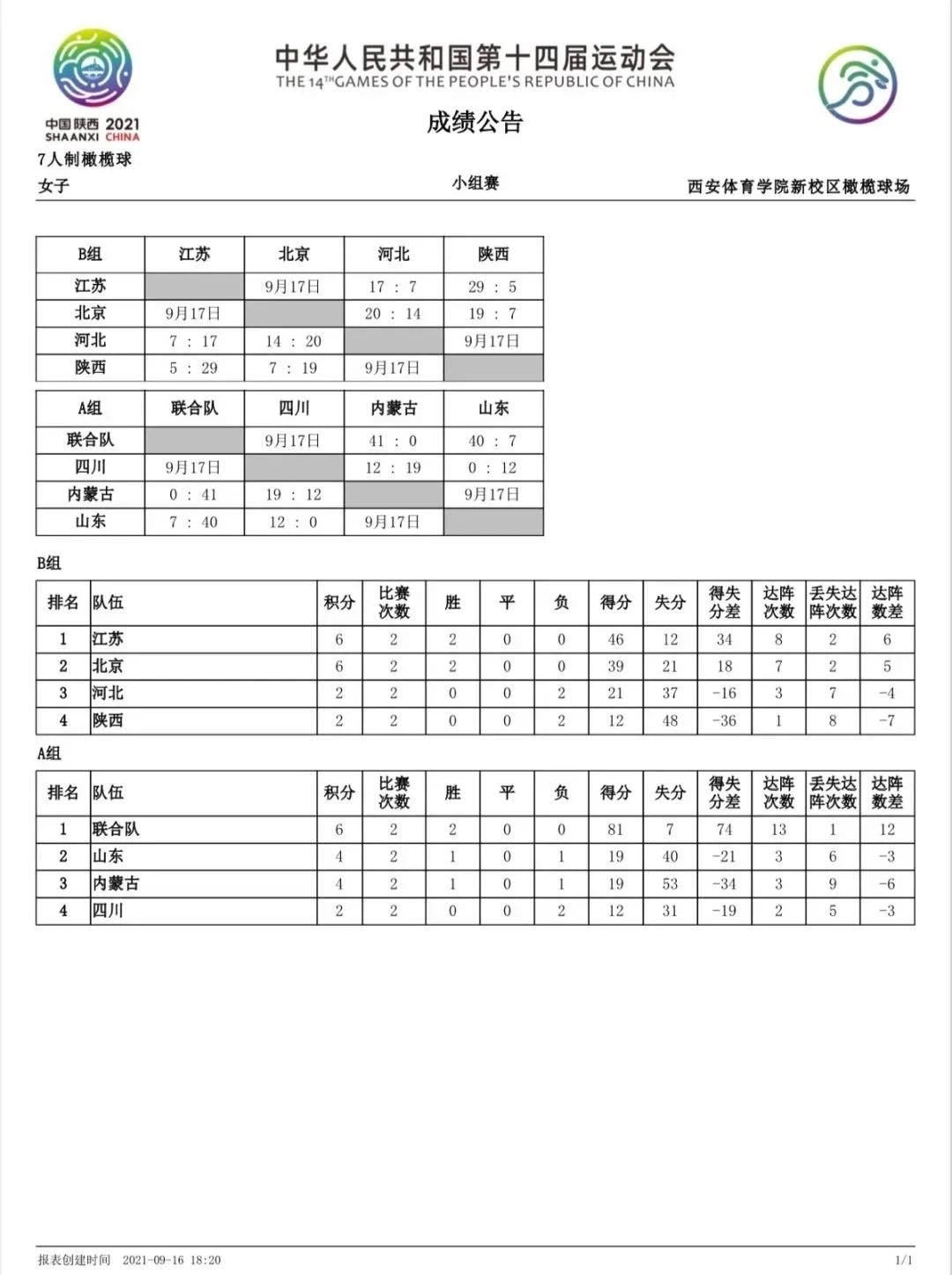 9月16日,第十四届全国运动会7人制橄榄球比赛在西安体育学院新校区橄榄球场开赛。本次比赛有来自全国10个省市的16支参赛代表队角逐男、女项目金牌。