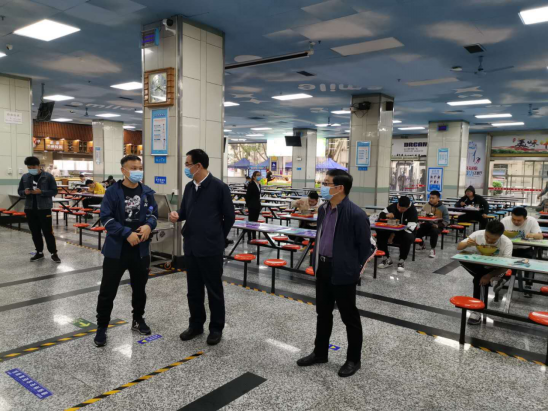 2020年5月8日我校第一批学生返校,校长朱元利、党委副书记刘子实、分管校领导李富生在后勤管理处(集团)处长许伟、副处长黄岗等相关负责人陪同下检查后勤防疫相关工作开展情况。朱元利、刘子实检查学生餐厅,实地查看学生错峰就餐方案实施情况,询问学生饮食情况,强调,学生餐厅一定要注意科学合理消毒通风,加强饮食安全把控;李富生到访学生公寓,亲切问询学生近况,叮嘱学生注意个人防护,尽快适应返校复课节奏,以积极的心态面对毕业求职。