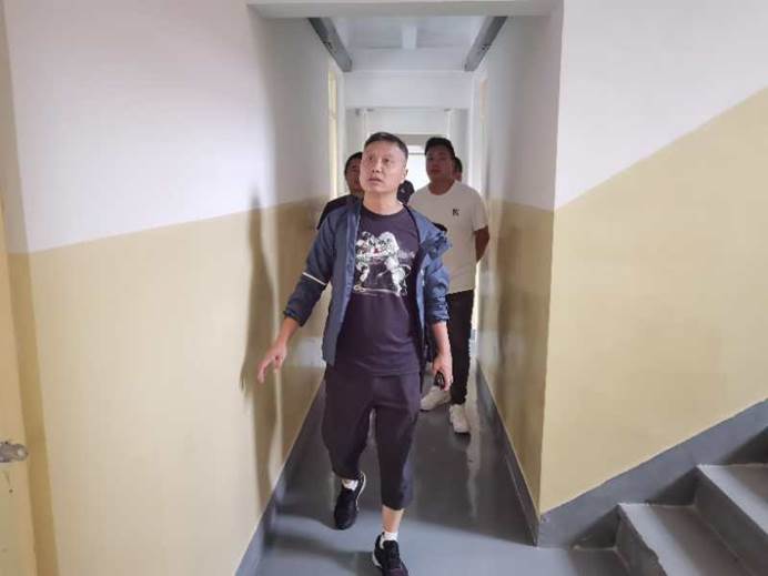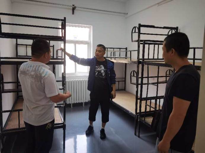 2020年8月21日后勤管理处(集团)处长许伟与后勤管理处(集团)沣峪校区学生公寓加固项目工作组对沣峪校区学生公寓加固施工现场进行实地查看。