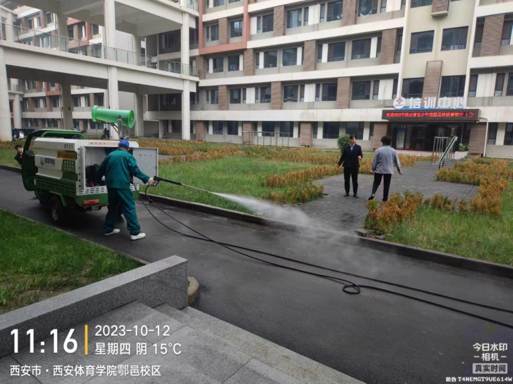 2023年10月12日,后勤管理处(集团)物业中心对鄠邑校区路面积水和淤泥进行清理,为保障师生出行安全。