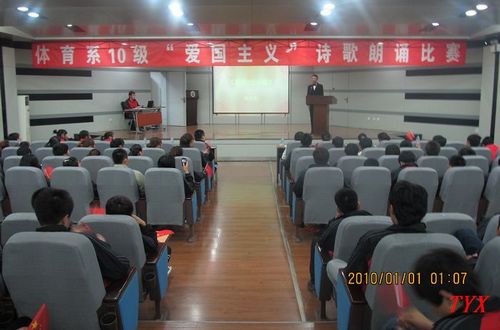 日前,体育教育系2010级在教学楼101教室举办了一场别开生面的爱国诗歌朗诵比赛。比赛中,同学们或深情款款,或高亢激昂,诠释了自己对诗歌的热爱,对祖国的热爱。
