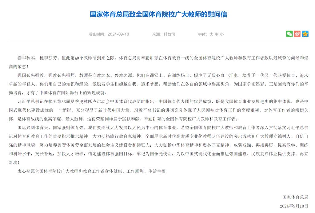 本网讯 在第40个教师节来临之际,国家体育总局、陕西省体育局发来慰问信,向辛勤耕耘在体育教育一线的广大教师、教育工作者致以诚挚问候和节日祝贺。