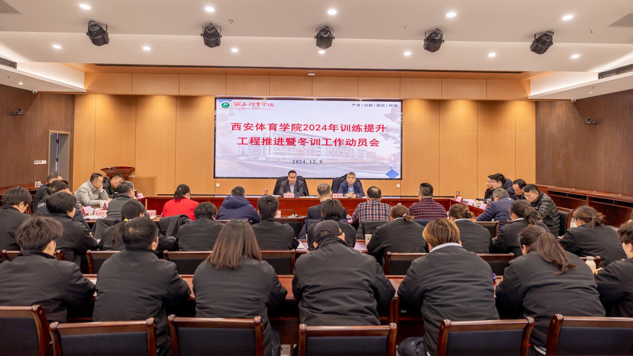 本网讯 12月9日下午,我校召开训练提升工程推进暨冬训工作动员会,校长李富生出席并讲话,副校长张葆欣主持。相关职能部门和二级学院负责人,陕西西安体育学院女垒全体教练员、运动员,竞技体育教练员、运动员代表参会。