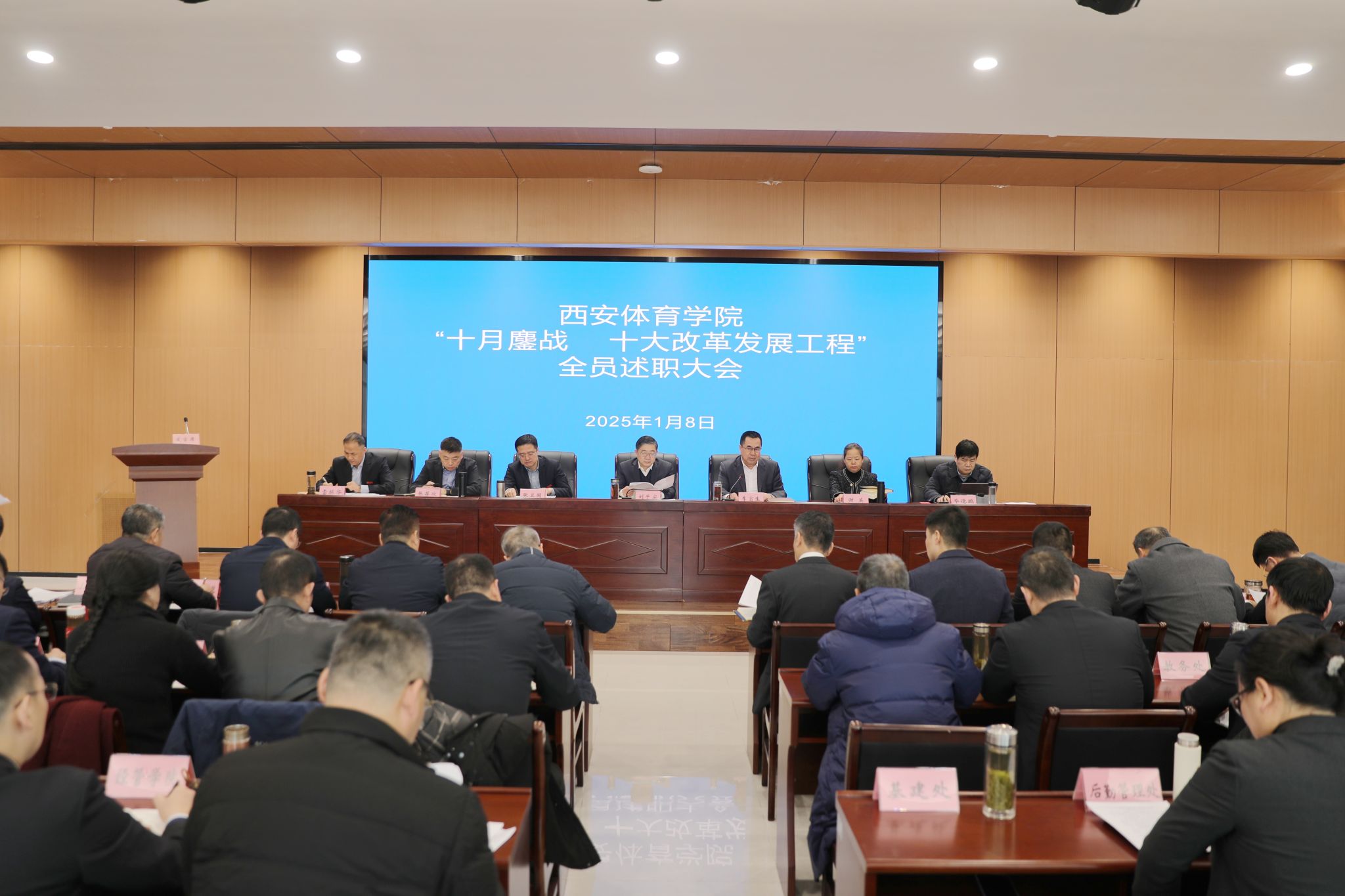本网讯 1月8日上午,我校在鄠邑校区召开“十大改革发展工程”全员述职大会。全体在校领导出席,副处级以上干部、现场述职的科级及以下职工参加,大会由校长李富生主持。