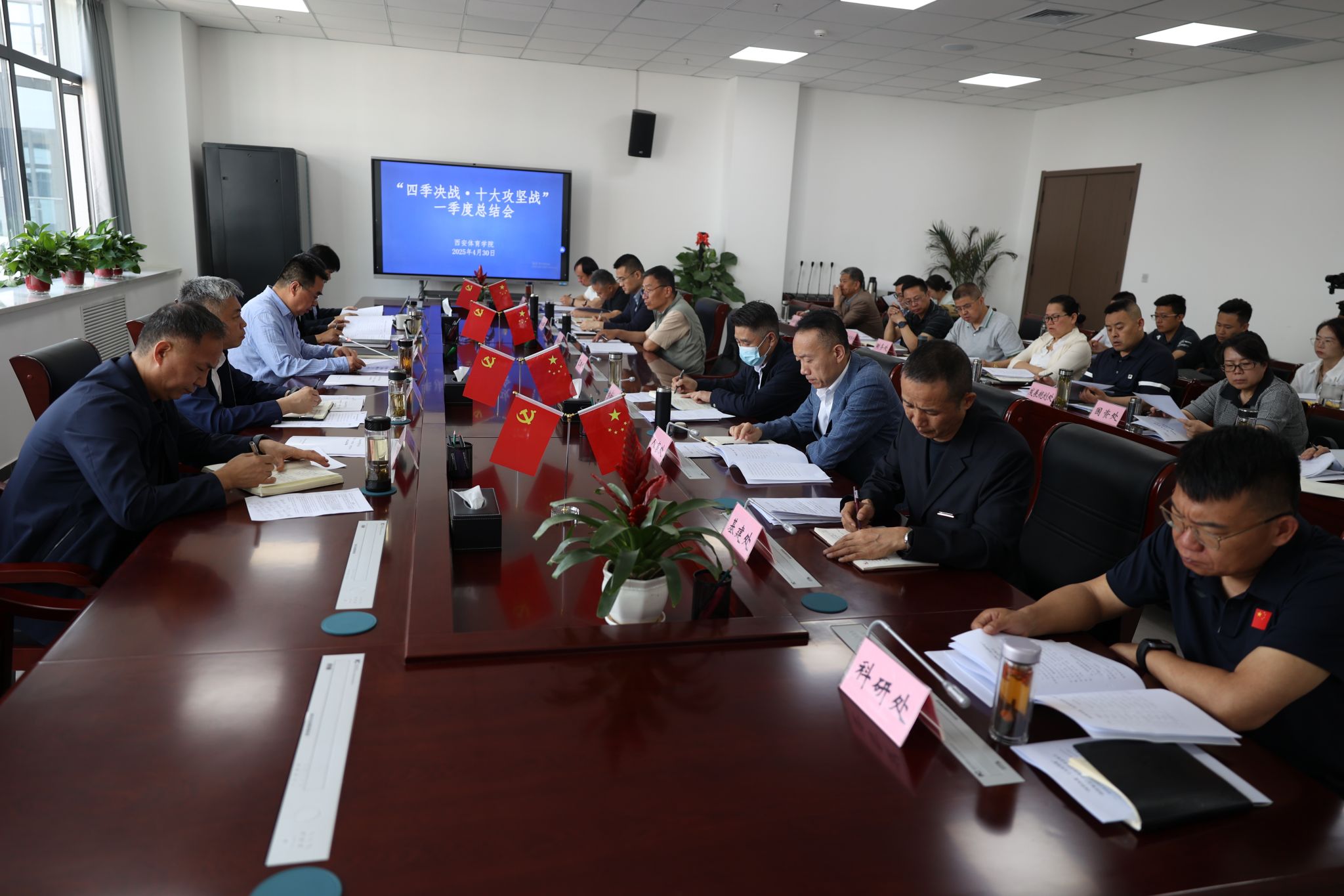 李富生围绕重点工作取得新成效、推进工作建立新机制、决战态势形成新气象、创新宣传产生新效应四个方面总结第一季度工作情况,并谋划部署下一阶段重点任务:一要加大创收造血力度,将年度目标拆解为季度目标,积极整合资源,探索多元模式,激发创收造血的新动能,实现“造血”“育人”双提升;二要加大师德师风建设力度,牢牢抓住教育部相关政策推进的绝佳机遇,严把教师思想政治关和师德关,通过评选师风师德标兵、进行先进事迹宣讲等途径,树立榜样示范;三要加大学风建设力度,完善制度,从严要求,发挥榜样引领作用,营造良好学习环境,提升就业质量,以整学风促校风;四要加大人事改革力度,实施岗位分类管理,强化管理效能提升,充分激发办学活力,为学校高质量发展提供制度保障。“十大攻坚战”要齐头并进,协同发展,强化统筹协调,优化资源配置,确保各项攻坚战按照既定的时间表、路线图稳步推进,共同形成西体改革发展的生动实践。