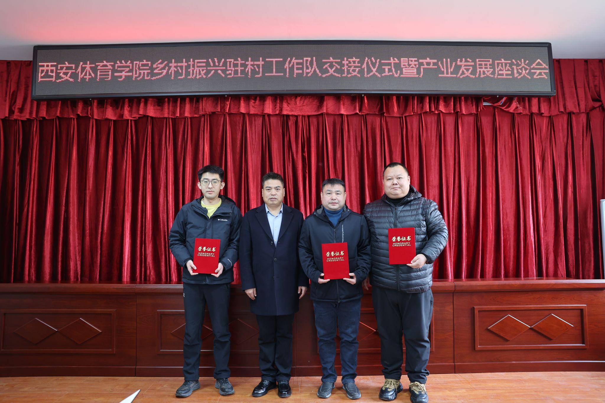 交接仪式上,县河镇为西安体育学院和谢坝村驻村工作队员颁发了锦旗和特殊贡献奖证书,谢坝村也为驻村工作队员赠送了锦旗,以表达对他们辛勤付出的感激之情。随后,谢坝村新老驻村工作队进行了队旗交接,标志着新一轮驻村工作正式拉开序幕。