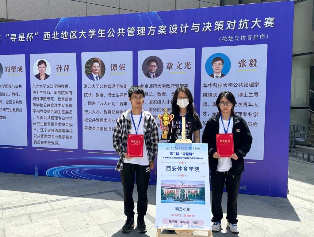 本网讯   5月27日-29日,由甘肃省管理类专业教学指导、认证与教材建设指导委员会主办、兰州大学管理学院承办的第二届“寻是杯”西北地区大学生公共管理方案设计与决策对抗大赛在兰州大学圆满举办。我校体育经济与管理学院公共事业管理专业本科学生李佳晨、谢静茹、马琮在杨涛、穆晓两位老师的指导下,从西北地区42所高校、43支参赛队伍(200余名师生)中脱颖而出,荣获二等奖。