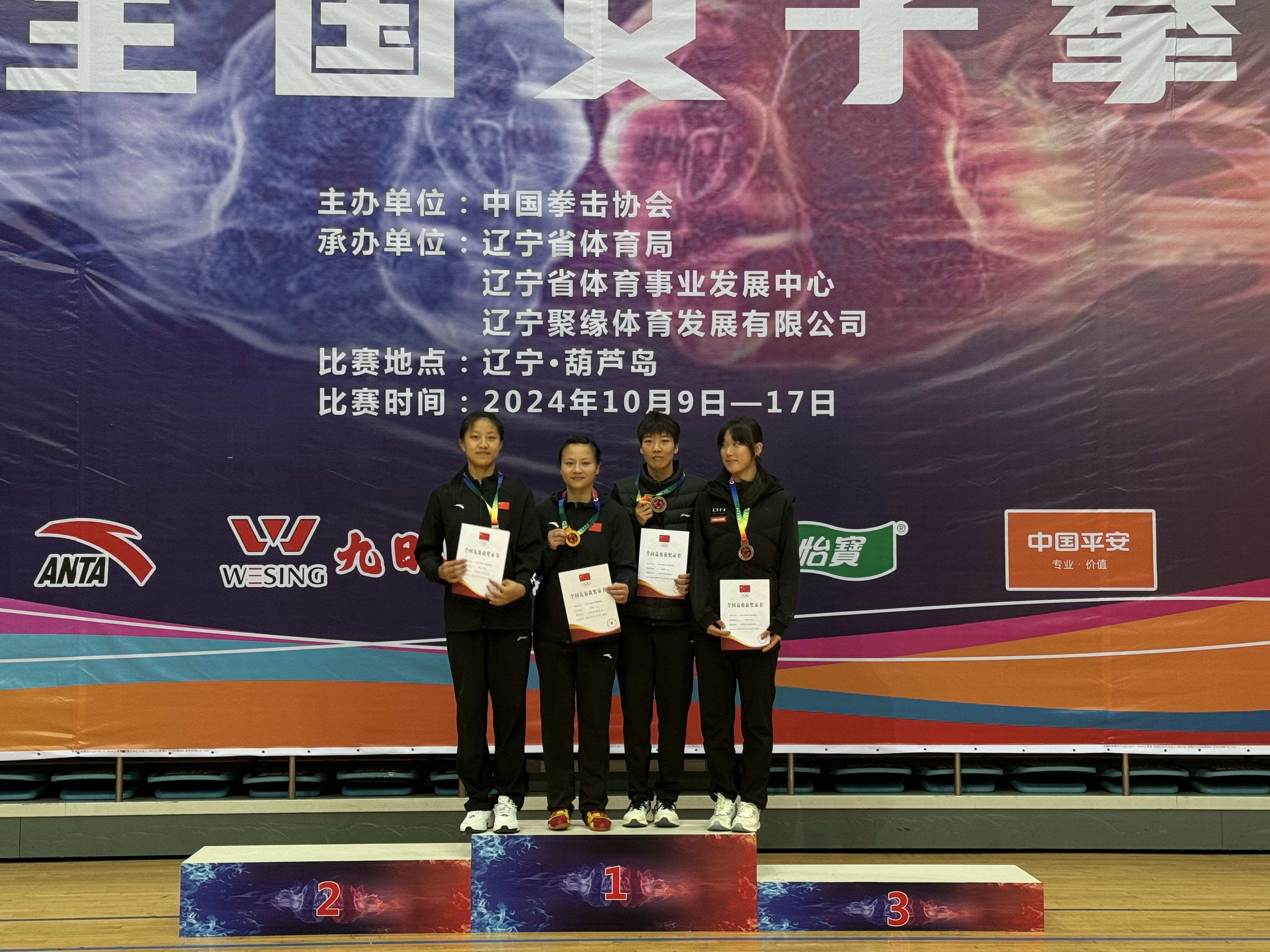 2024年全国女子拳击冠军赛于10月9日至17日在辽宁葫芦岛进行。本次比赛吸引了国内优秀女子拳击选手参加,包括代表国家队参加巴黎奥运会的拳手,比赛设12个级别,经过激烈角逐,最终成绩落定,我校教师刘飘飘以5:0比分,在决赛中取得52-54公斤级冠军,我校学生田淑文获得66-70公斤级亚军、朱亚姝、齐昕宇分别取得第五名的好成绩。