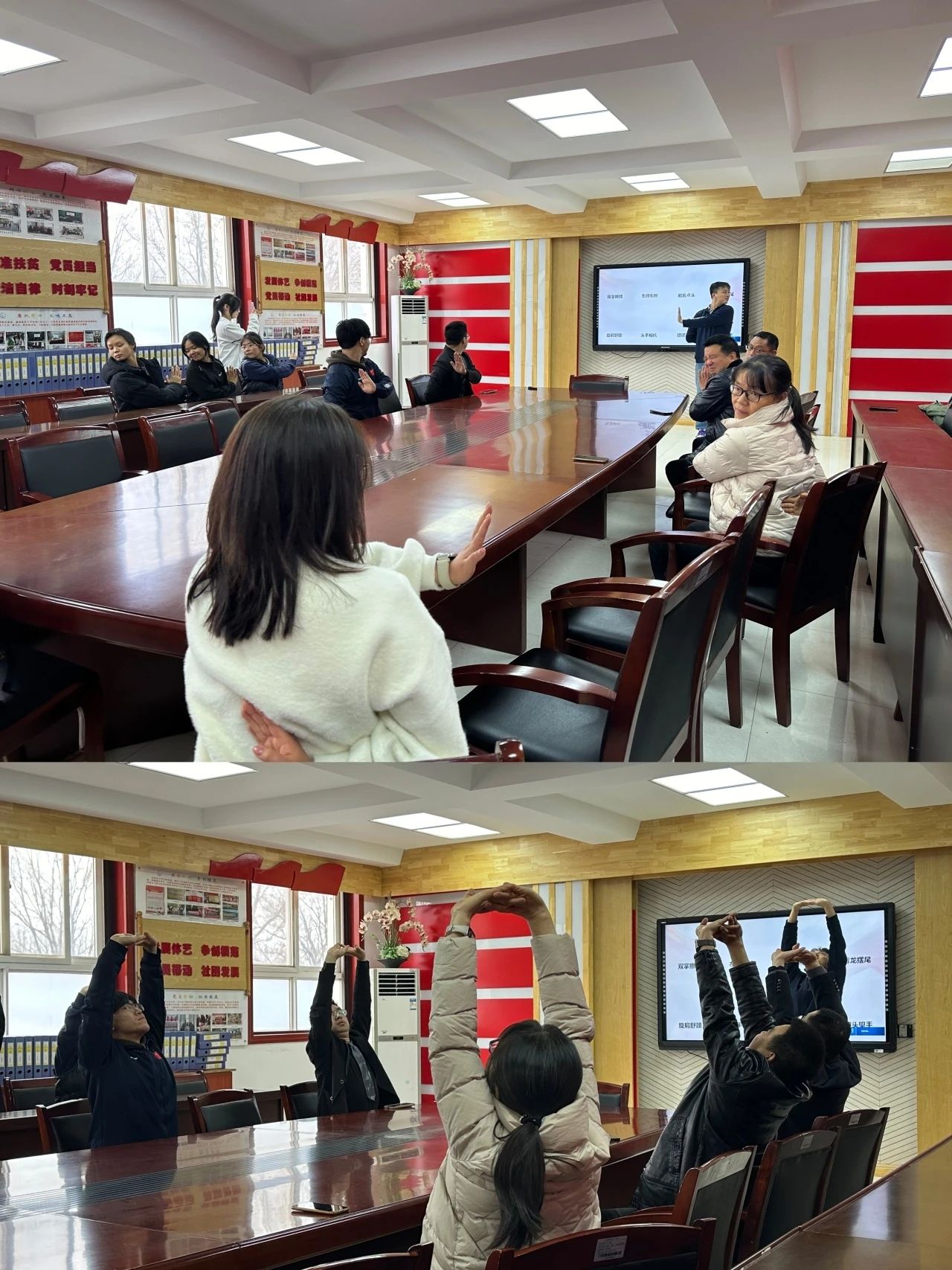 康保现任会长陈文杰、王昱彬、蔡青、商子茉在台上为老师们带来可以缓解疼痛疲劳的颈椎操,一步一步仔细讲解和演示,恢复正常人体颈椎的生理曲度、促进血液和淋巴循环,缓解颈部肌肉僵硬,老师和同学们纷纷积极配合,事后也表示效果显著!