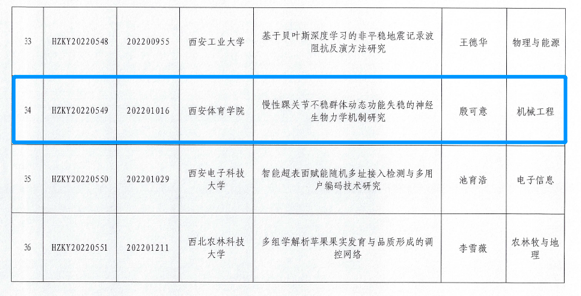近日,教育部国际合作与交流司公布了《关于2022年度教育部“春晖计划”合作科研项目立项的通知》,我校运动与健康科学学院青年教师殷可意申报的研究课题《慢性踝关节不稳群体动态功能失稳的神经生物力学机制研究》成功立项。陕西省高校此次仅获批36项。