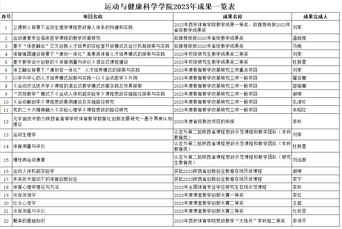 在西安体育学院2023年度课堂教学创新大赛中,李红、王超、杜新星三位老师分别获得大赛一、二、三等奖。在2023年度西安体育学院思政教学“大练兵 ”比赛中,我院李伟平老师获学科组二等奖。