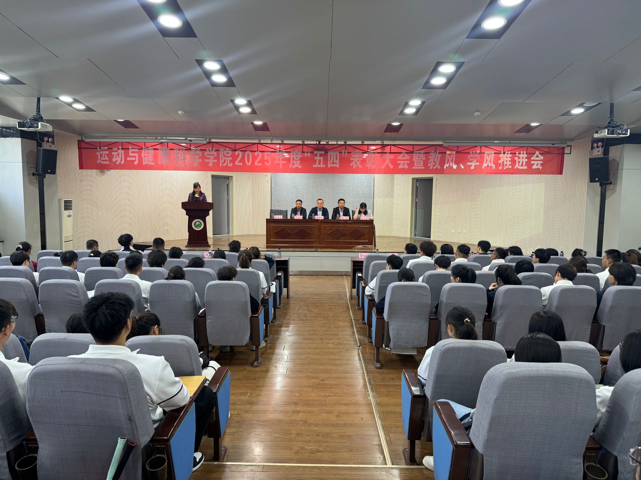 4月23日中午,运动与健康科学学院在教学楼一楼报告厅召开2025年度“五四”表彰大会暨教风、学风推进会。学院领导班子、各教研室主任、支部书记、科级以上干部、全体专兼职辅导员、教师代表、学科带头人、新进博士及各年级学生代表出席会议。大会由学院副院长杜新星主持。