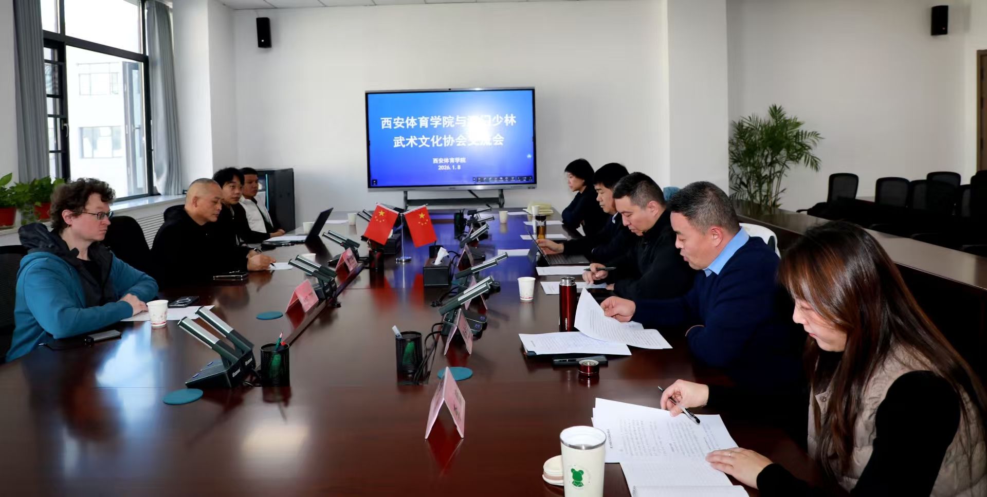 202618日,澳门少林武术文化协会会长曹文亭、理事长曹源一行莅临我校开展武术交流活动。我校副校长毕德鹏、武术学院院长袁金宝、套路教研室主任罗雪琳、马文国教授、国际交流与合作处全体人员共同参会。