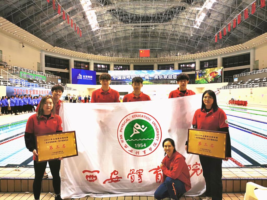 经过3天的激烈角逐,我校体育教育学院游泳教研室殷剑侠老师带领的西安体育学院代表队,共有6名同学(来自运动训练学院的舒炀、文栎、耿雨博、徐龙源、王俞萱、李东海)在院校组的比赛中共斩获五项冠军、六项亚军、三项季军,同时分别获得男女团体总分前三的优异成绩!我校代表队依然展现出了永不言弃、顽强拼搏的体育精神!