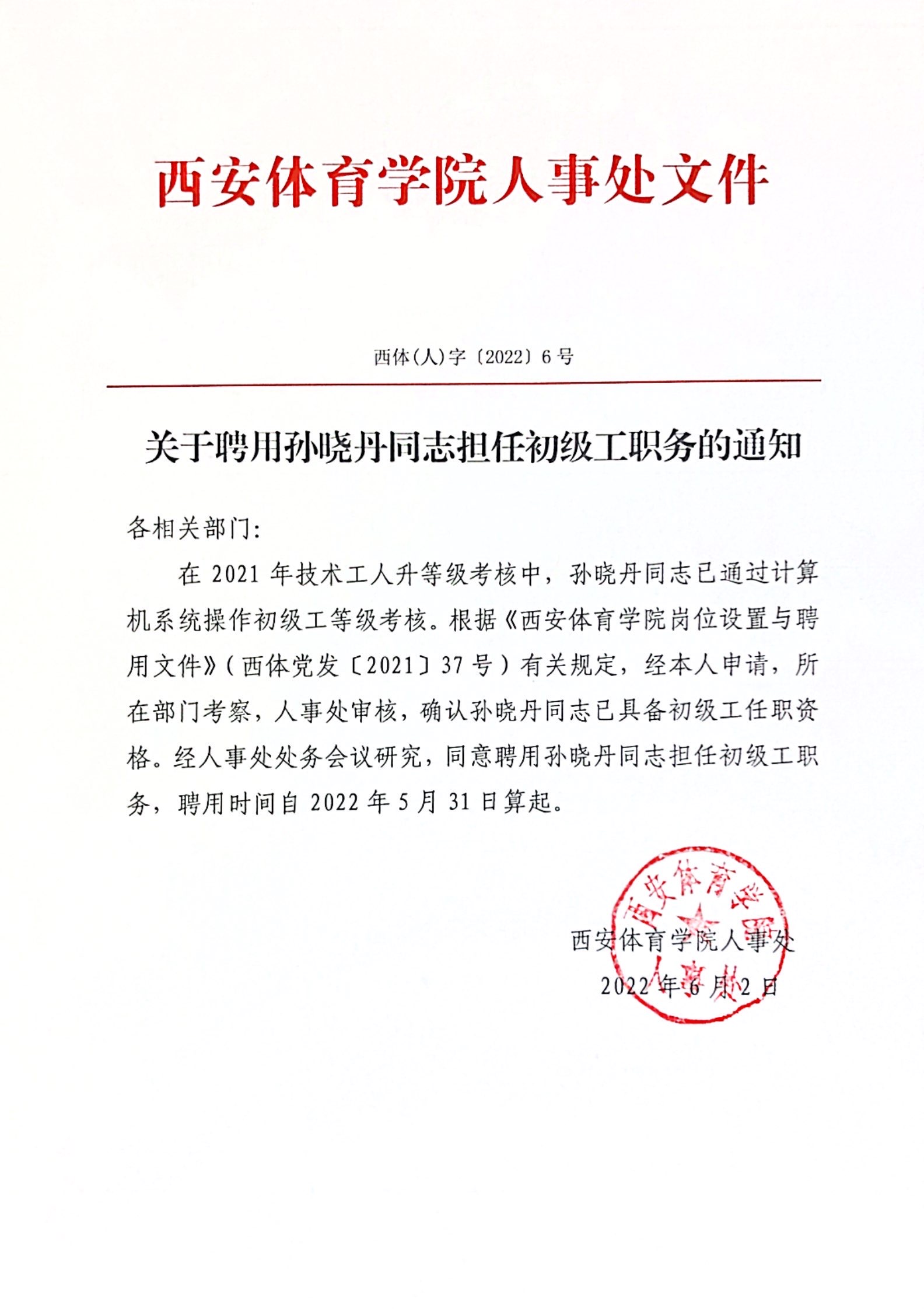 关于聘用孙晓丹同志担任初级工职务的通知