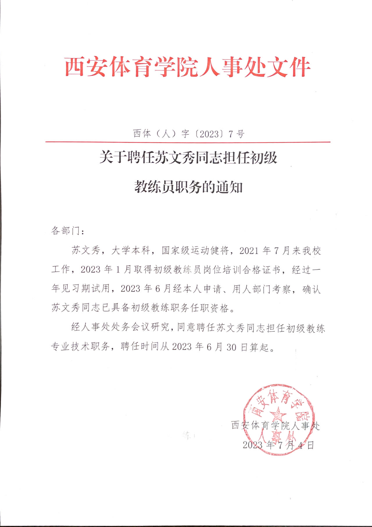 关于聘任苏文秀同志担任初级教练员职务的通知