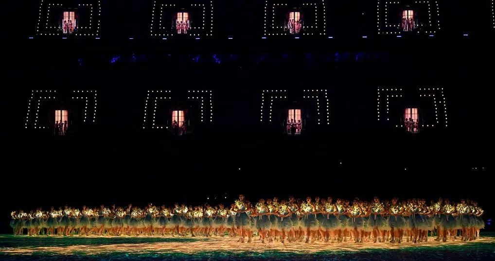 开幕式第三篇章《携手同行》,三十二名西体学子参演情景剧表演《万家灯火》,主席台对面得观众席中隐藏了近百个小舞台,像是每一户家庭的窗户缓缓打开,呈现万家灯火的景象,万人同唱《梦想天堂》,打造幸福家园的场景。