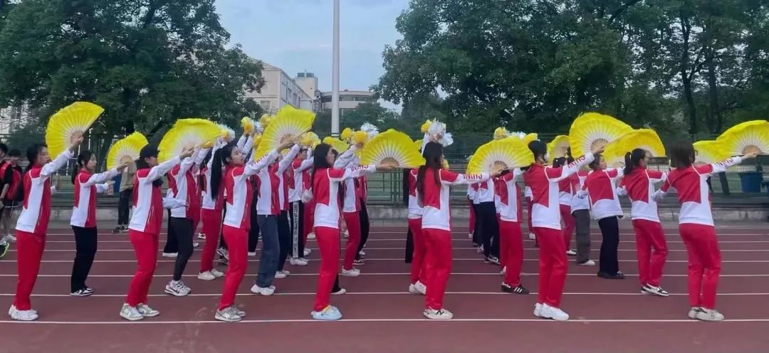 方阵中朝气蓬勃的艺院学子,散发出青春气息,无不展现了艺院学子的朝气与活力。白黄两色的花球高举头顶,黄灿灿的扇子如起伏的波浪是艺院师生继往开来、乘风破浪的勇气与决心。