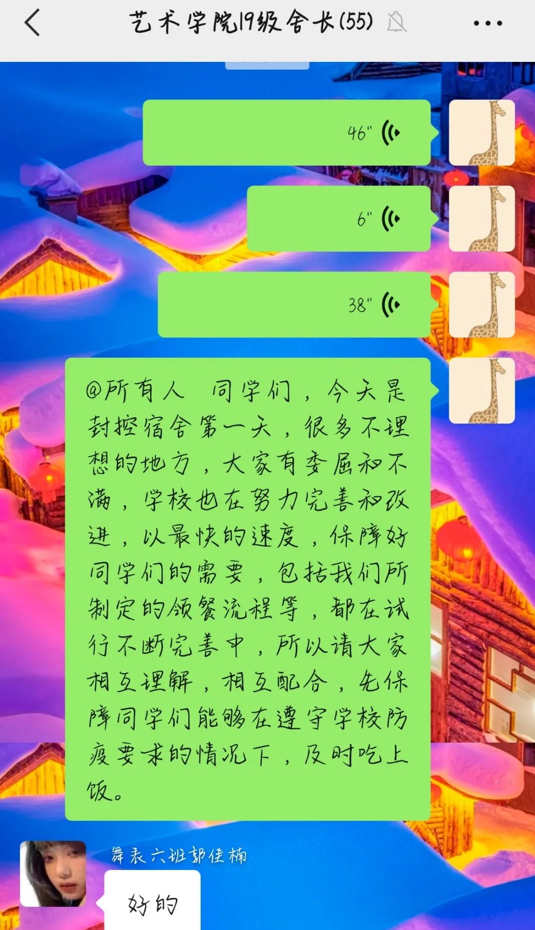 3.为防止人员混乱和意外发生,各宿舍购餐的同学必须为舍长(如遇特殊情况:舍长生病等问题,需提前向楼长报备)。