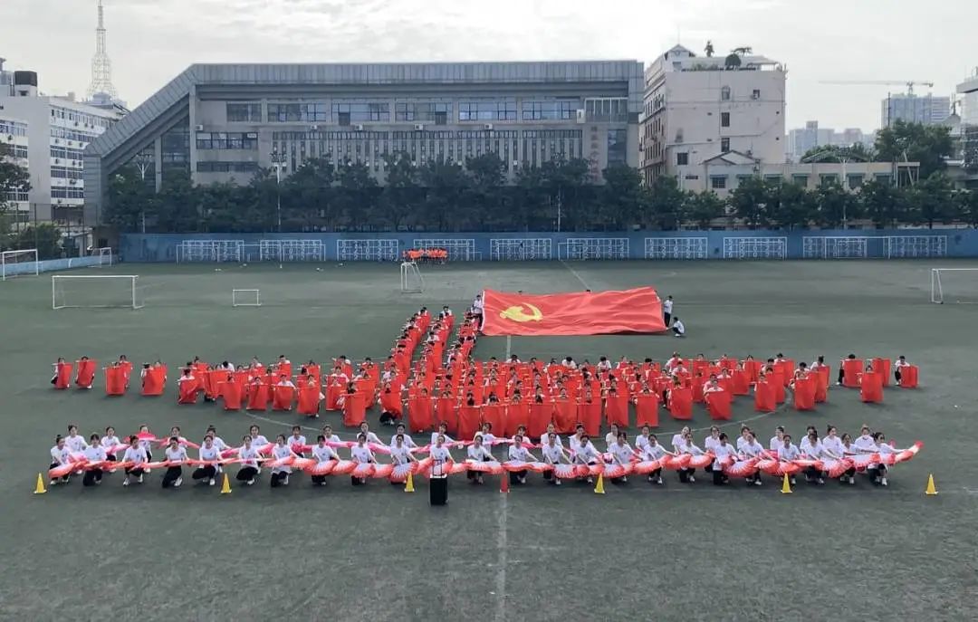 此次大型团体操《党旗下的誓言》用不断变化的圆形、波浪、菱形等经典造型来展现百年奋斗路的艰辛,用红船造型展示中国革命精神之源的红船精神来激励和鼓舞全体师生坚定理想、百折不挠。