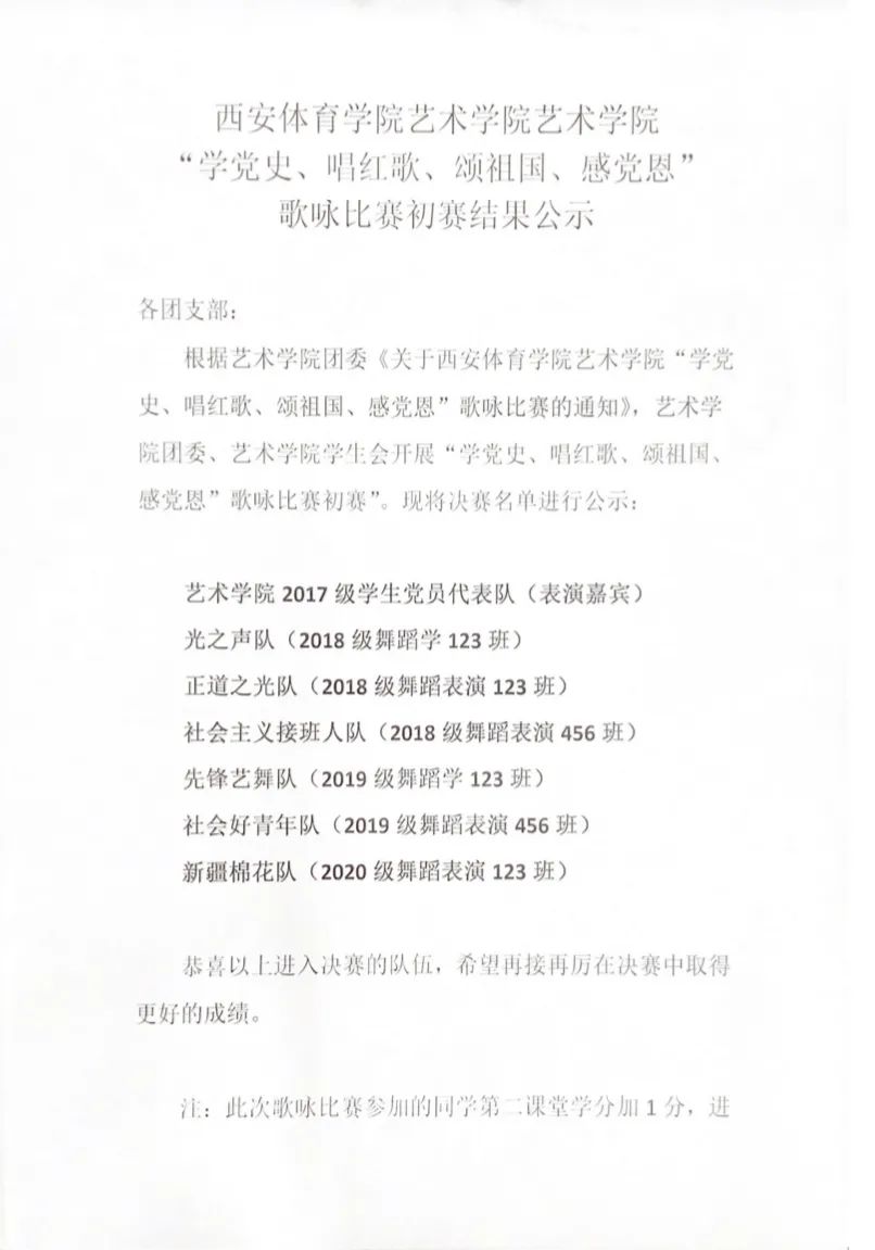 通过初赛评委老师们选出了最符合本次歌咏比赛主题的7支队伍进入决赛,公示结果如下: