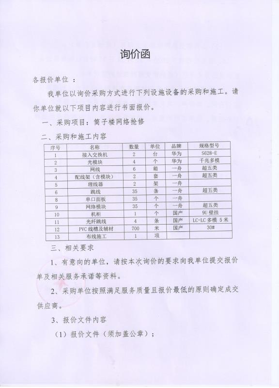西安体育学院筒子楼网络抢修询价函