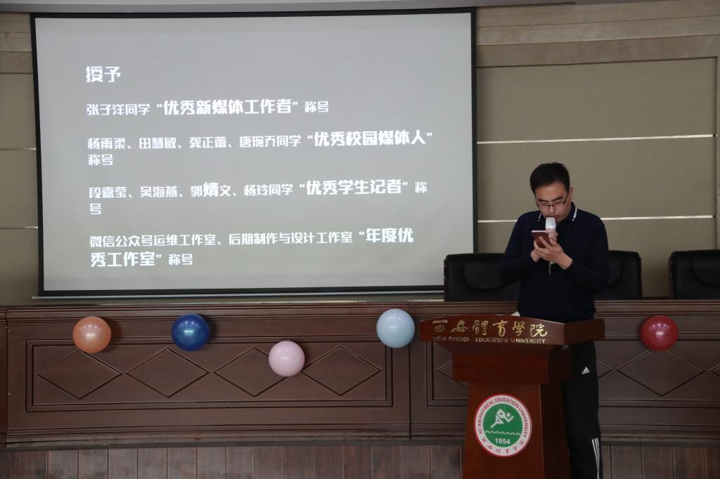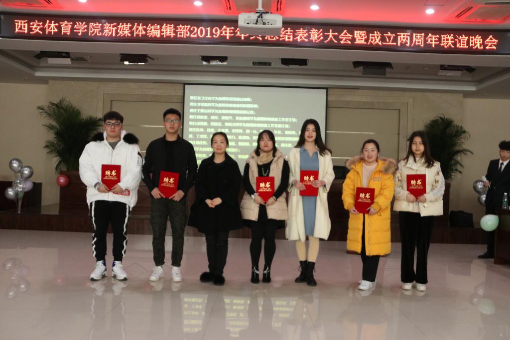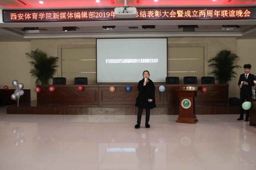 2019年12月30日,西安体育学院新媒体编辑部2019年年终总结表彰大会暨成立两周年联谊晚会在二号综合办公楼六楼报告厅举办。校党委宣传(统战)部副部长杨柳、新媒体中心副主任孙妍、理论教育科副科长张媛、新闻宣传科倪威胜、新媒体编辑部指导教师顾彬等老师出席本次活动。