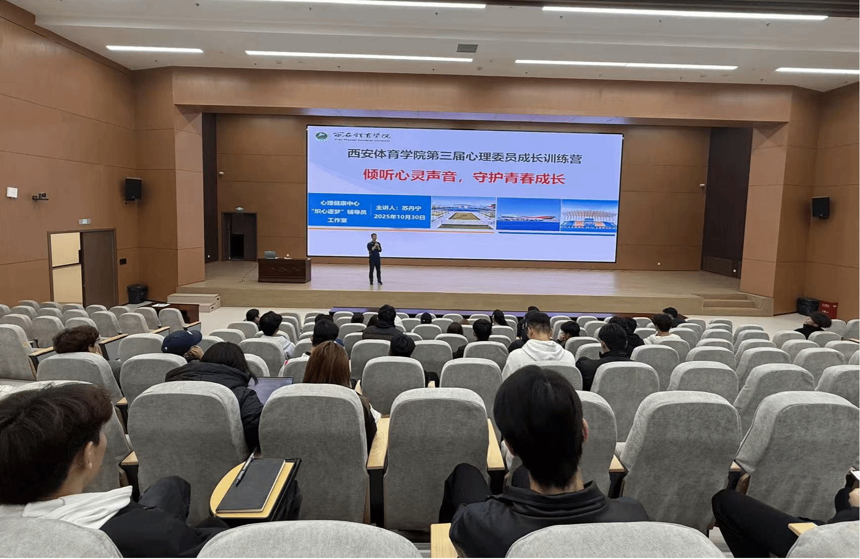10月30日晚,鄠邑校区教学综合楼3楼报告厅内座无虚席。学工部苏丹宁老师聚焦我校心理健康教育资源及心理委员工作职责、心理互助技术,从“如何识别心理问题”到“突发性心理危机事件的处理”详细介绍危机事件的应对流程,更通过视频案例提升心理委员组织心理健康主题班会的实务能力,同学们结合案例展开研讨,表示收获丰硕。