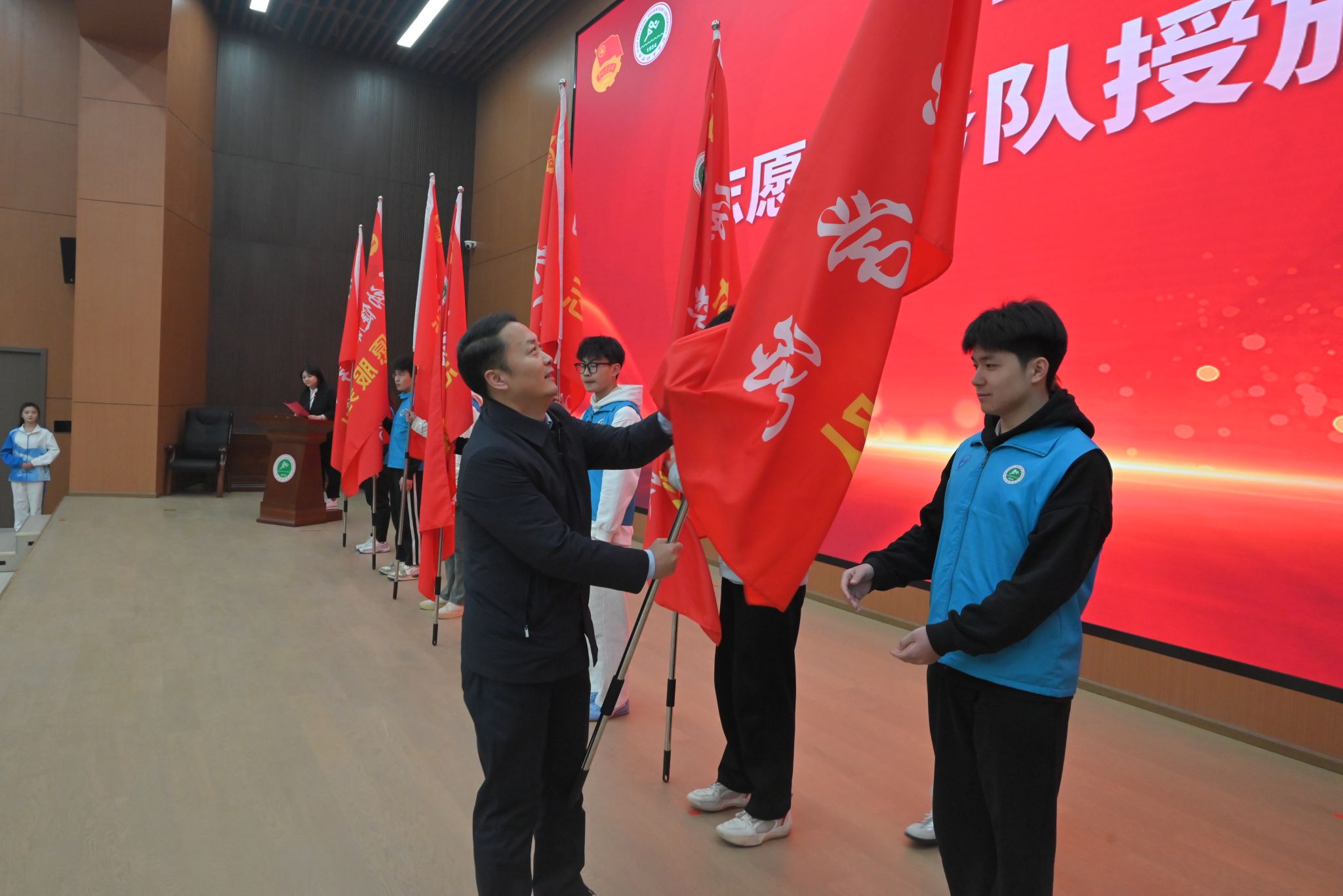 马海涛为志愿服务队授旗,对我校志愿者们献身志愿服务的精神表示肯定,希望有更多同学能够投身到我校“3.5学雷锋志愿服务行动月中来,广泛参与到“雷锋月”系列活动中来,认真开展雷锋精神学习交流,围绕全民健身推广需求和学校发展建设需要,针对性设计志愿服务项目并推动服务常态化,让志愿行动在校园蔚然成风,共同上好时代发展的思政课和文明校园治理的实践课。