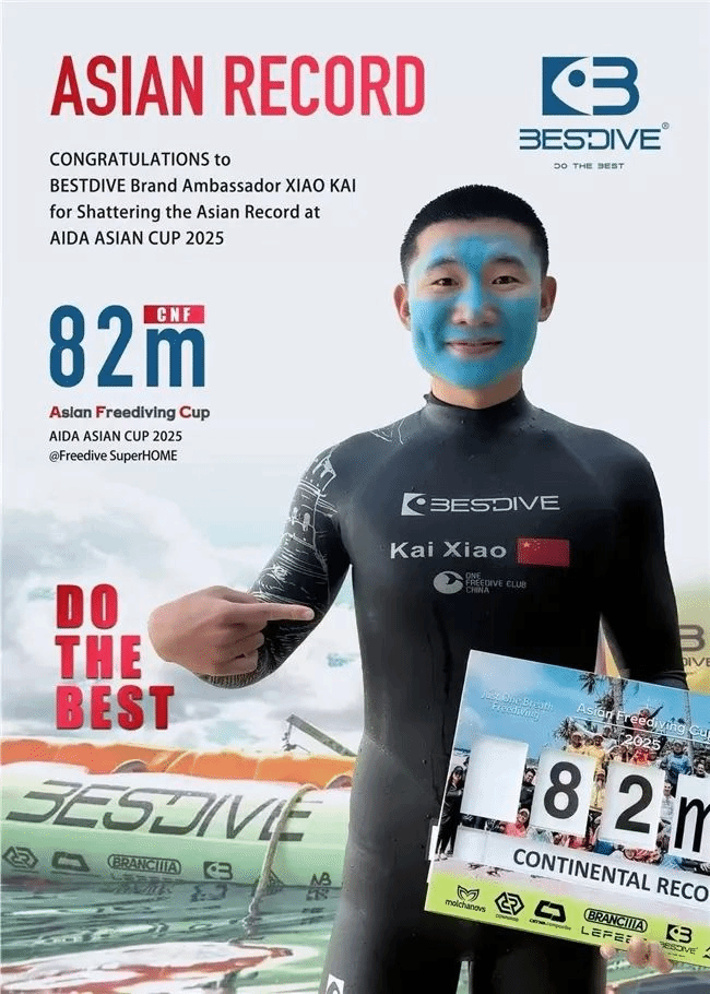 2025年6月8日—— 在菲律宾邦劳岛上举办了自由潜水亚洲杯(Asian Freediving Cup),中国运动员肖凯在此次比赛中上演了震撼人心的一幕。在最具挑战性的男子CNF(恒重无蹼)项目中,他连续三次下潜,以77米、80米和最终定格在82米的惊人深度,三次刷新亚洲纪录!这不仅让他成为该项目无可争议的新亚洲纪录保持者,更使他成为亚洲首位在同一赛事中三破洲际纪录的自由潜水运动员。