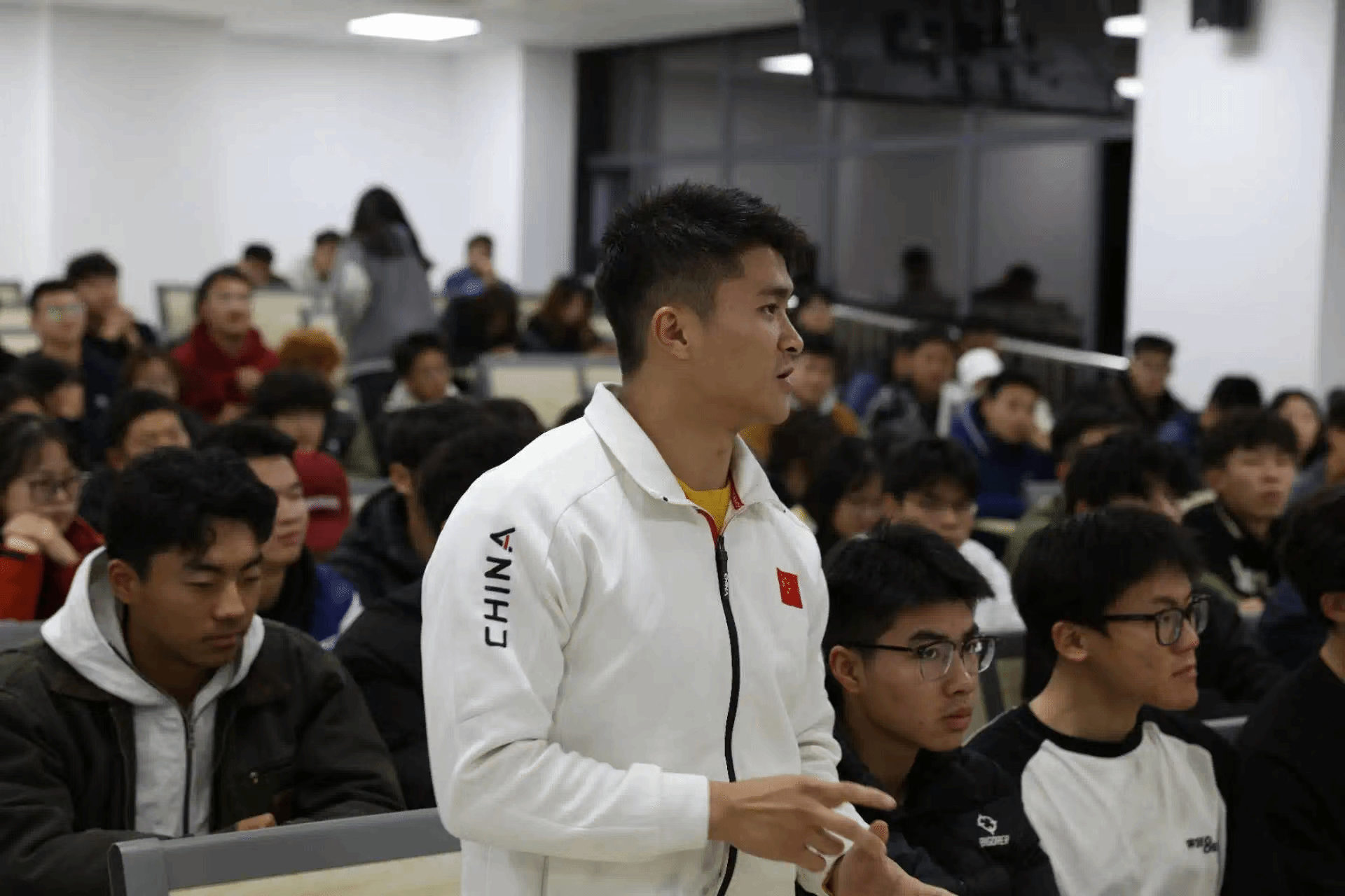 “少年应有鸿鹄志,当骑骏马踏平川”。活动的开始由介绍吴景彪的短视频引入。在演讲过程中,吴景彪以幽默、打趣自己的语言分享了自己从被启蒙教练选中到世界冠军的这一路走来的传奇励志经历,鼓励同学们要不怕苦难、迎难而上,人生有无数个目标,但每一个目标都是“芝麻开花节节高”,要为自己的目标赋予实际行动与奋斗。