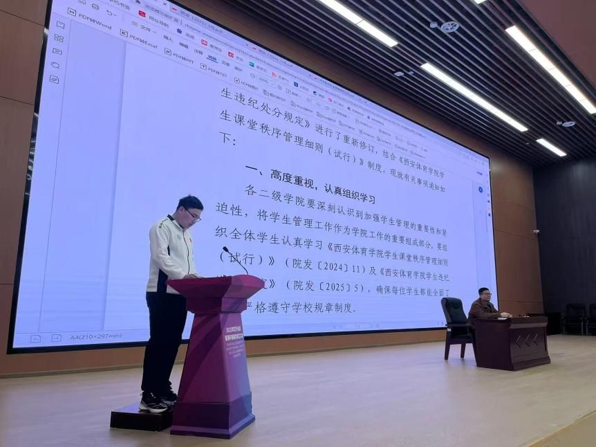 会议伊始,由年级纪律负责人体育教育专业2023级2班潘俊言进行考勤汇报。接下来,潘俊言带领全体同学领学《关于进一步加强学生管理工作的通知》;3班班长何炳坤、10班班长李文昊、11班班长杨菲雨带领全体同学领学《西安体育学院学生违纪处分规定》;2班纪律委员张宇晨带领全体同学领学《西安体育学院学生课堂秩序管理细则》。3班王培明同学在会上做出禁烟表态并领学《关于教学区全面禁烟的公告》,通过文件的学习,同学们更加明确制度不仅是约束,更是成长的保障,让我们从日常细节做起,养成教育,将纪律内化于心,外化于行共建成长进步的和谐美好校园。