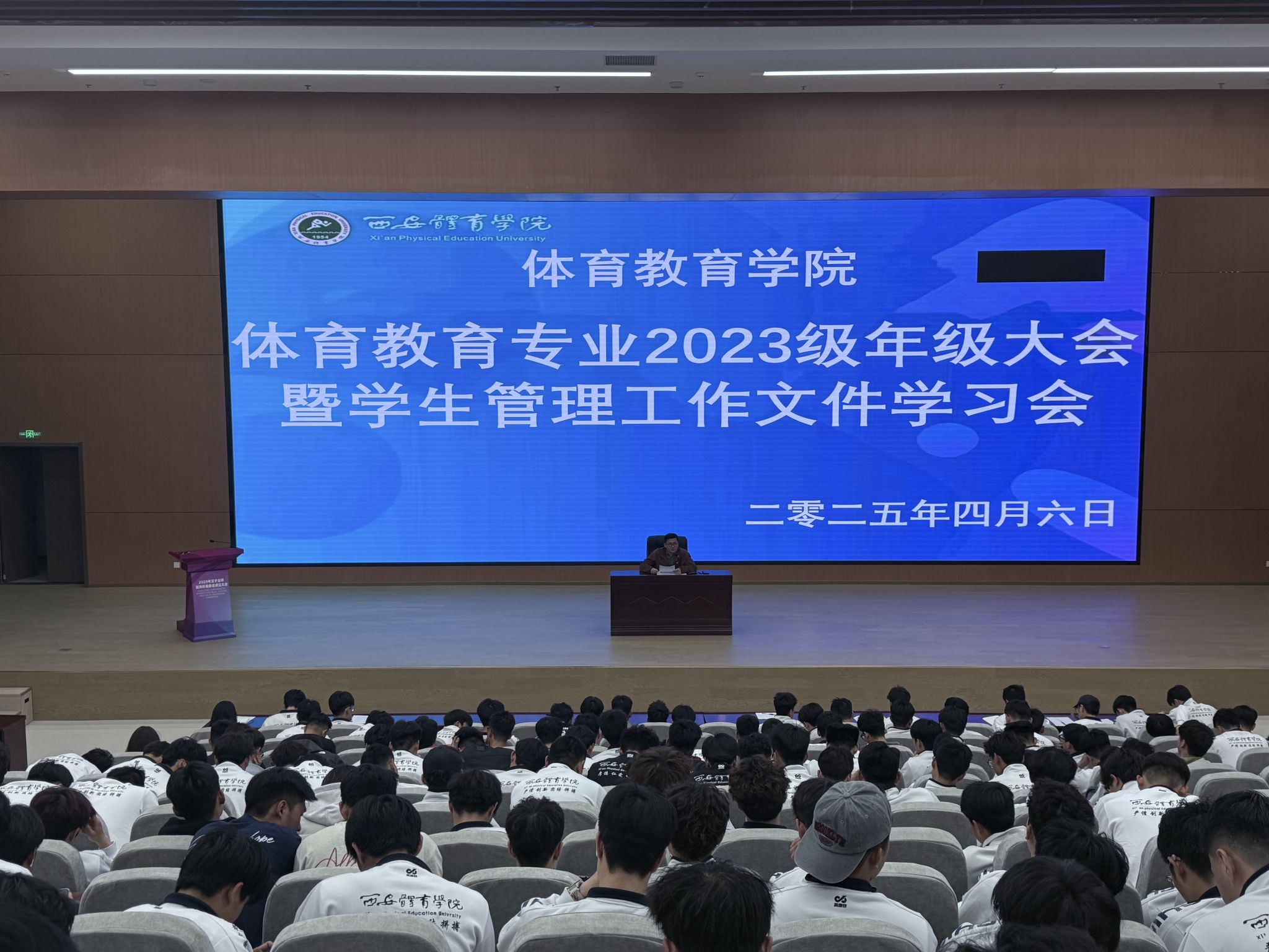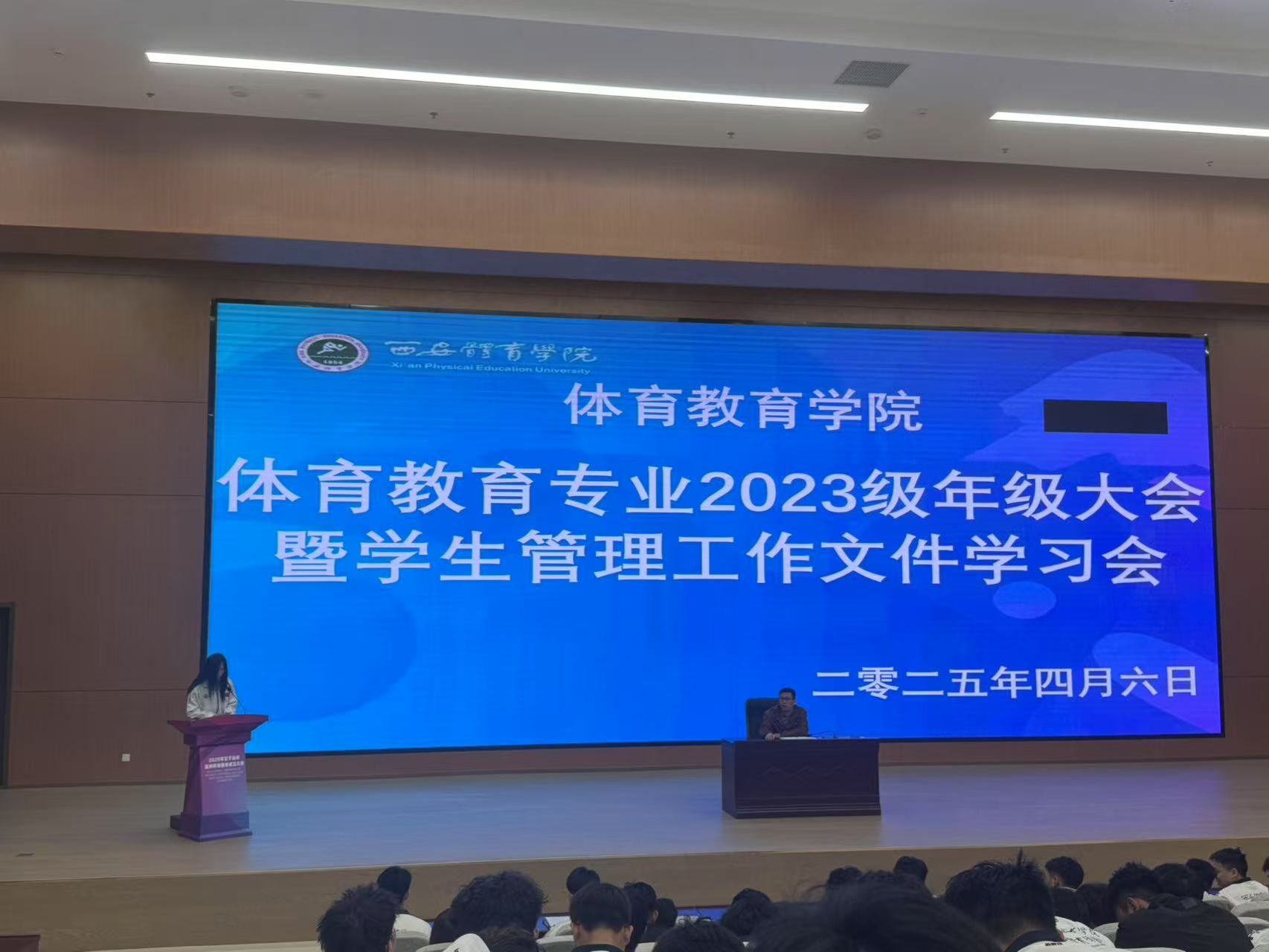 为进一步加强学生管理,推动学风建设,营造风清气正的校园环境,为学生的成长成才提供坚实保障,促进学生全面发展。体育教育专业2023级于4月6日21:00在图书馆三楼报告厅召开年级大会暨学生管理工作文件学习会。会议由年级办公室主任李馨主持,全体2023级学生参会。会议聚焦制度学习、文件解读、主题发言、榜样引领与责任践行等重点开展,贯彻“四季决战”精神为年级发展注入奋进力量。