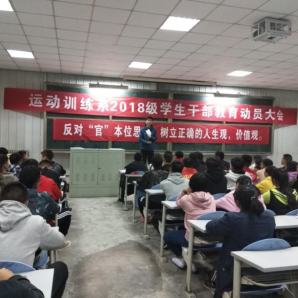 本网讯 近期,部分院校学生干部的工作存在功利化、庸俗化问题受到社会广发关注。为了让学生干部树立正确的人生观,价值观,建设一支胸怀理想、作风扎实的学生骨干队伍。10月11日,运动训练系2018级特召开学生干部教育动员大会。