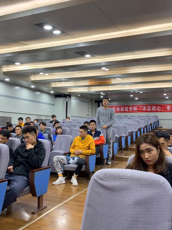 随后武洛生向学生全面介绍了从建系之初到学院的成立,运动训练专业走过了近五十年的发展历程,为新中国培养了2万余名体育专门人才。始终坚守着教育的初心,始终不忘人才培养的质量,坚持以学生成长成才全面发展为中心,期望同学们在新时代体育强国建设中会有更大的作为。最后为在座的学生提出了两点希望:一是要树立远大志向,励志前行;二是要刻苦学习,追赶超越。希望所有同学用发展的眼光看待学习的问题,树立付出必有回报的决心,好好解决学习中存在的困难和问题。