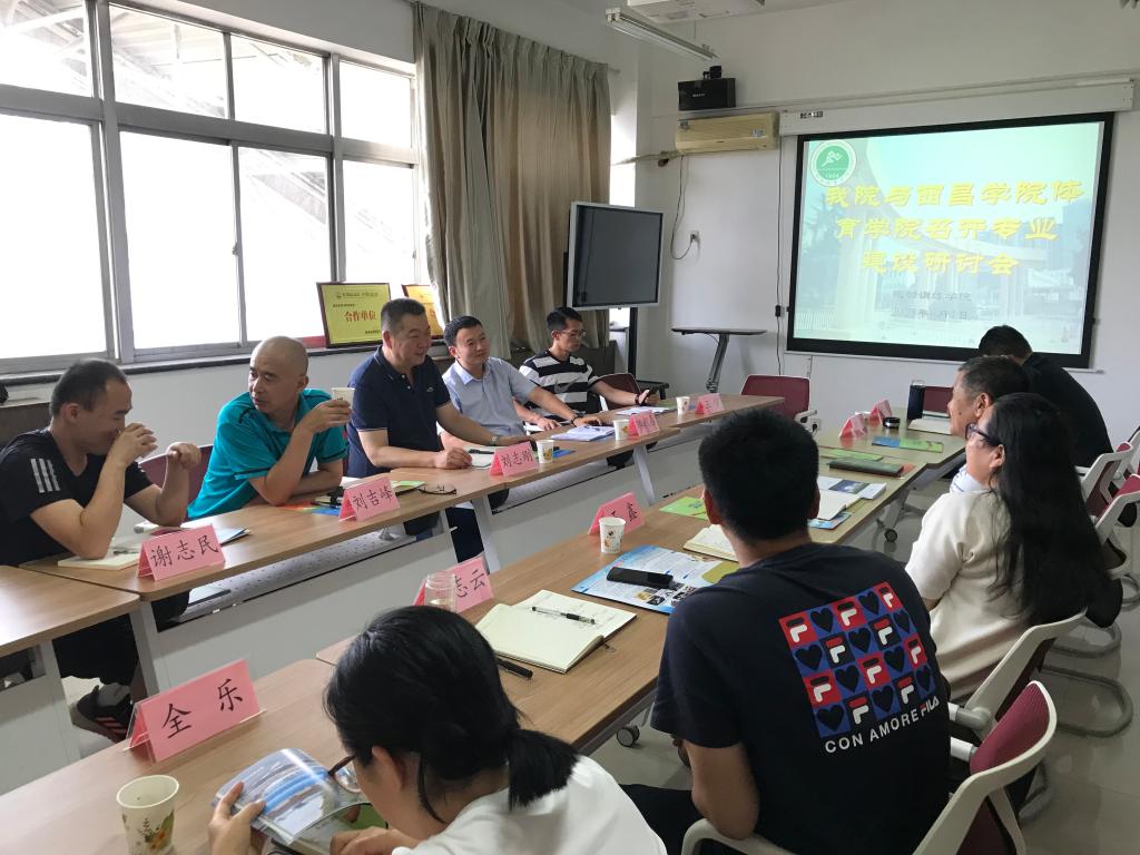 6月1日下午2: 30在综合训练馆六楼会议室,运动训练学院与西昌学院体育学院召开专业建设交流会。主要参会人员有西昌学院体育学院院长刘志刚、副院长郎朝春、体育教育教研室主任刘吉峰、科研秘书王强、教师谢志民、教师王泽刚;运动训练学院党政领导班子成员、办公室成员、各教研室主任和书记。本次会议由副院长郑峰主持。