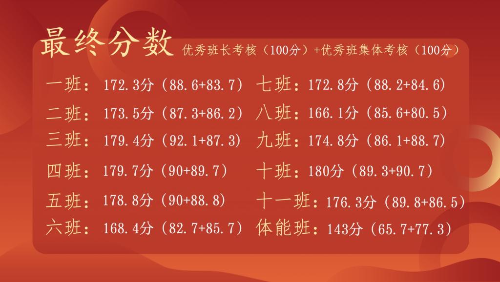 为进一步提升班长的工作能力,全面总结本学期各班工作的亮点与不足,不断加强各班集体之间的相互学习。22级年级办于1月4日组织召开“2023年班长述职总结大会”。本次大会邀请到运动训练学院团委书记于昕、体育教育学院团委书记宗月民、运动休闲学院辅导员黄晖、运动训练学院辅导员罗玄、李丹、吴奇,体育教育学院辅导员宋昂、足球学院辅导员宋颖博等八位老师作为评委进行打分。
