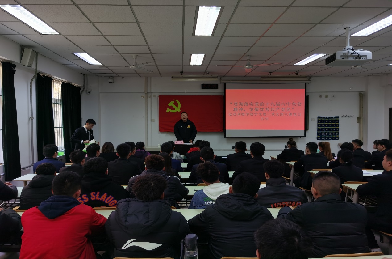 2021年11月17日在教学楼103教室,运动训练学院学生第二党支部开展“贯彻落实党的十九届六中全会精神,争做优秀共产党员”主题党日教育实践活动。目的是要把学习贯彻党的十九届六中全会精神作为当前和今后一个时期的重要政治任务,统筹安排,严密实施,确保取得实效加强革命传统教育,增强全体党员责任意识和爱国情怀。