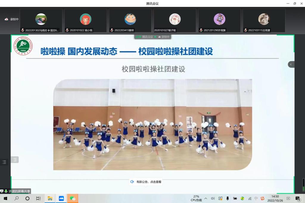 2022年10月26日下午两点,西安体育学院研究生部系列学术讲座在线上腾讯会议如期举行。硕士研究生导师许波教授做了题为《体教融合背景下校园啦啦操发展趋势》的主题学术报告。本次讲座由许波教授主讲,研究生部副主任刘远新主持,我校研究生及部分教师约300余人聆听了该讲座,学生们参会热情饱满、求知若渴。