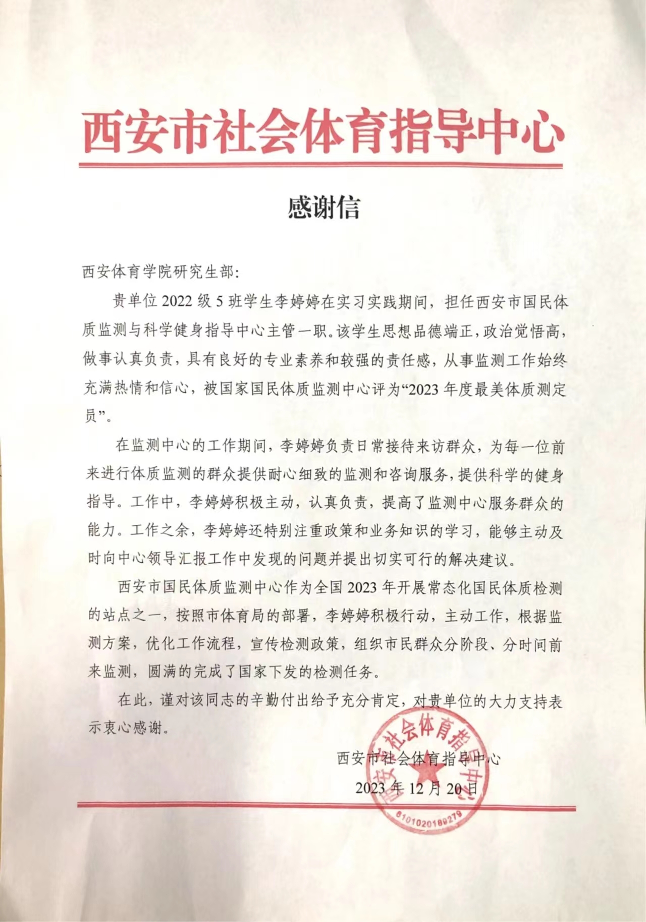 李婷婷是我校2022届休闲体育专业本科毕业生,目前是我校研究生部2022级5班学生。该生在西安市国民体质监测中心实习工作期间,表现出较高的个人素养和专业能力,注重理论与实践的结合,能够准确把握国民体质监测工作的重点内容和关键环节,耐心细致的为群众提供科学健身服务,得到了中心各级领导和群众的广泛赞誉。