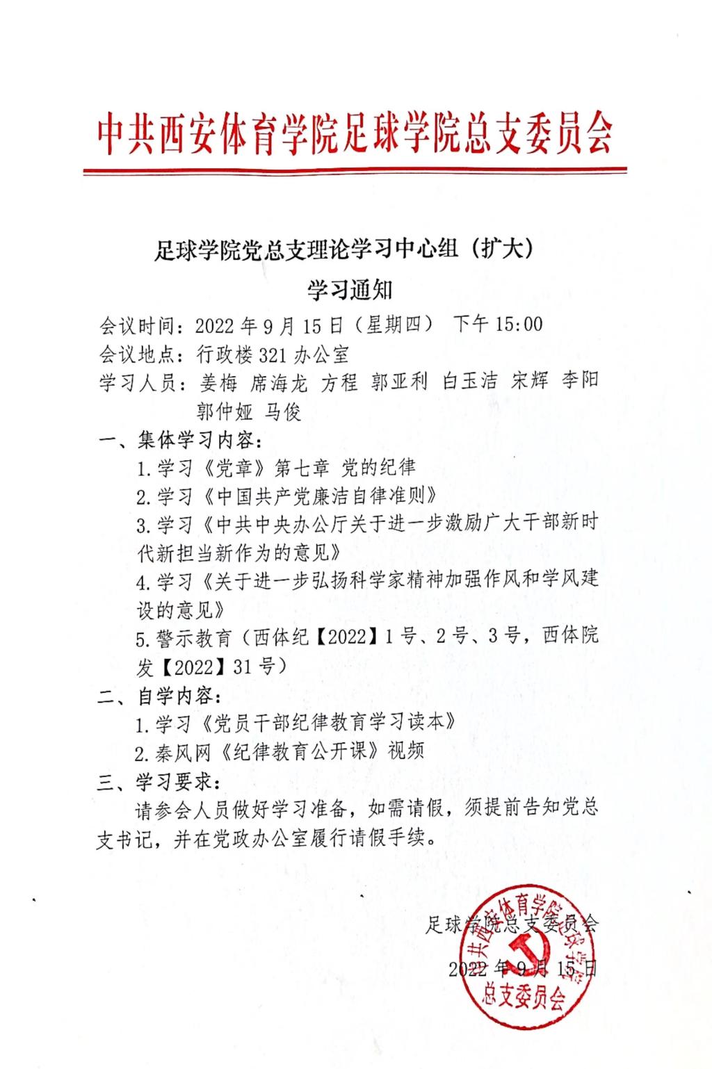 足球学院党总支理论学习中心组(扩大)学习通知