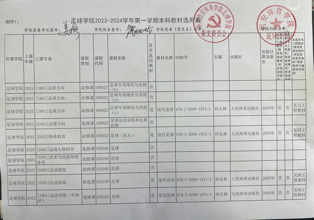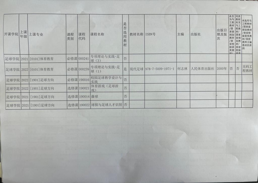 足球学院2023-2024学年第一学期本科教材选用公示