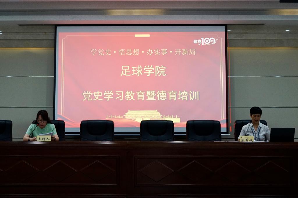 为使我院党史学习教育走实走深,根据《教育部关于在教育系统开展师德专题教育的通知》中“强化教师‘四史’学习教育,将‘四史’学习作为广大教师思想政治‘必修课’,结合建党百年系列庆祝活动,以党史学习教育为主线,强化‘四史’学习教育”、“用身边的榜样传递师德的力量 ”等精神,6月9日中午,我院在二号行政楼六楼报告厅举办“学党史 悟思想 立师德 铸师魂”主题教育培训。讲座邀请到西安体育学院马克思主义学院教授、陕西省师德标兵张美娥为学院全体教职工及学生党员、入党积极分子讲述百年党史及教师立德树人,会议由足球学院党总支书记姜梅主持。