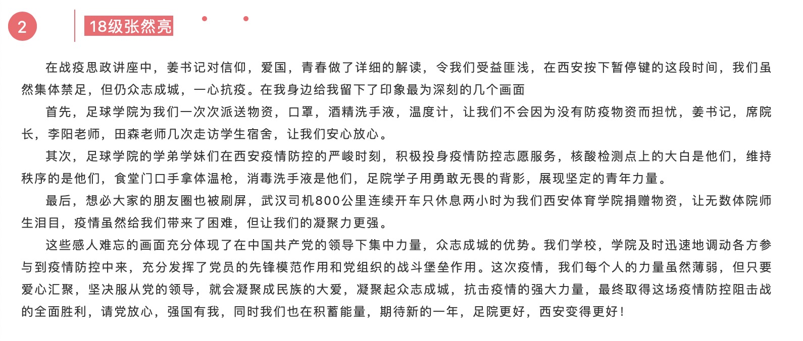 2021年与2022年之交的西安因为新冠疫情的突袭而变得不平凡,足球学院充分发挥网络优势,利用线上平台,全员行动、全过程行动、全方位行动,将此次疫情当成重要教材,把“三全育人”理念贯穿于整体工作,开展了线上系列“战疫”课堂,带给师生有温度的力量。